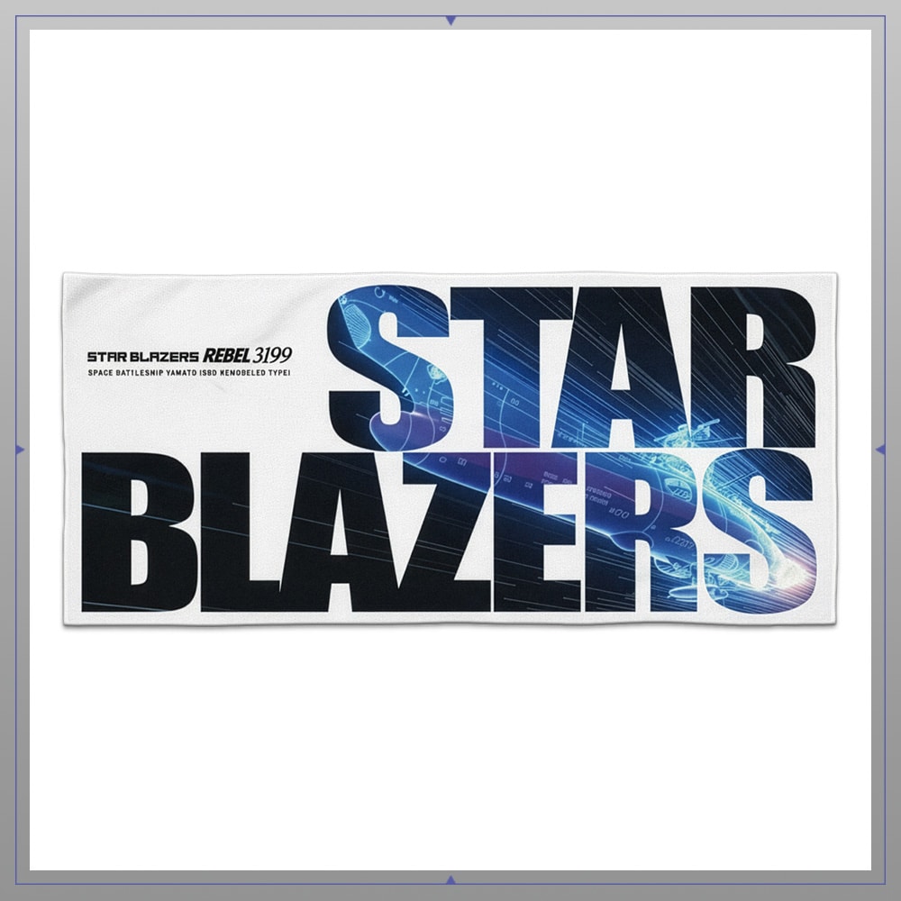 宇宙戦艦ヤマトのデザインのフェイスタオルです。英字と浮かび上がるようなヤマトの姿が素敵なデザインです。
